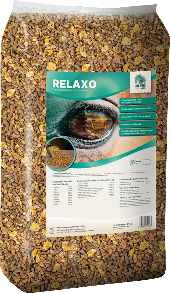 Du suchst ein haferfreies Müsli, das Energie liefert, dabei leicht verdaulich ist und durch hohe Akzeptanz überzeugt? ALL-WIN Horse Relaxo ist ein hochwertiges Ergänzungsfuttermittel, das speziell für Pferde entwickelt wurde, die ein getreidebasiertes Kraftfutter ganz ohne Hafer benötigen. Die Kombination aus hydrothermisch aufgeschlossenen Getreideflocken, strukturreichen Ballaststoffen und extrudierter Leinsaat sorgt für eine sehr gute Verdaulichkeit und hohe Schmackhaftigkeit. Mit kalkhaltigen Meeresalgen (Maerl) wird die Rezeptur zusätzlich auf natürliche Art ergänzt. Die sorgfältig abgestimmte Zusammensetzung macht Relaxo zu einer idealen Wahl für den täglichen Futterplan.