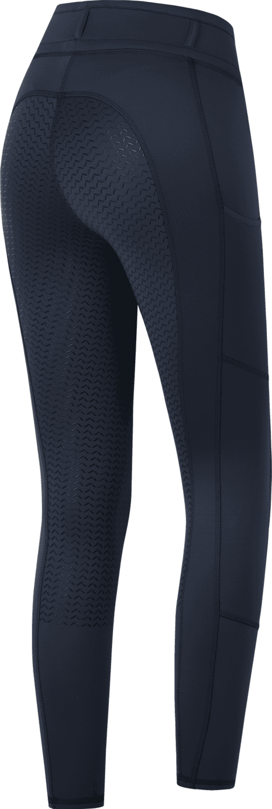 Für einen rutschfesten Halt sorgt der hochwertige Silikon-Vollbesatz, der mit einem dezenten Logo-Print versehen ist. Ein besonders praktisches Detail sind die Handy-Einschubtaschen, in denen du dein Smartphone während des Reitens sicher und jederzeit griffbereit verstauen kannst. Die Kombination aus Funktionalität und sportlichem Design macht diese Leggings zum idealen Begleiter für dein tägliches Training.
