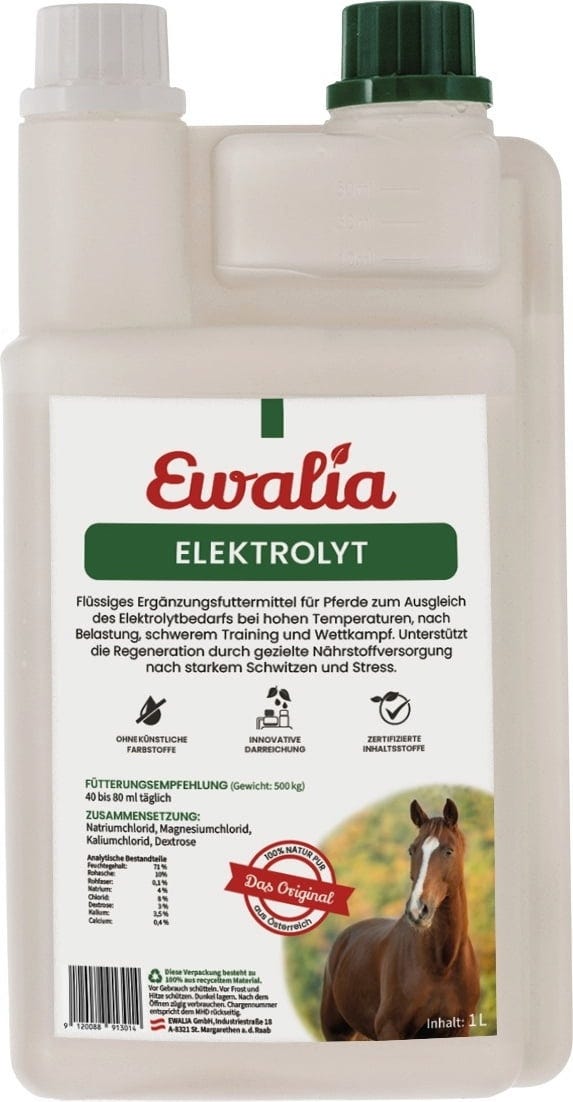 Das flüssige Ergänzungsfuttermittel trägt zur Regulierung des Elektrolytbedarfs bei hohen Temperaturen, nach Belastung, schwerem Training und Wettkampf bei. Es versorgt das Pferd nach starkem Schwitzen, oder Stress gezielt mit Nährstoffen.