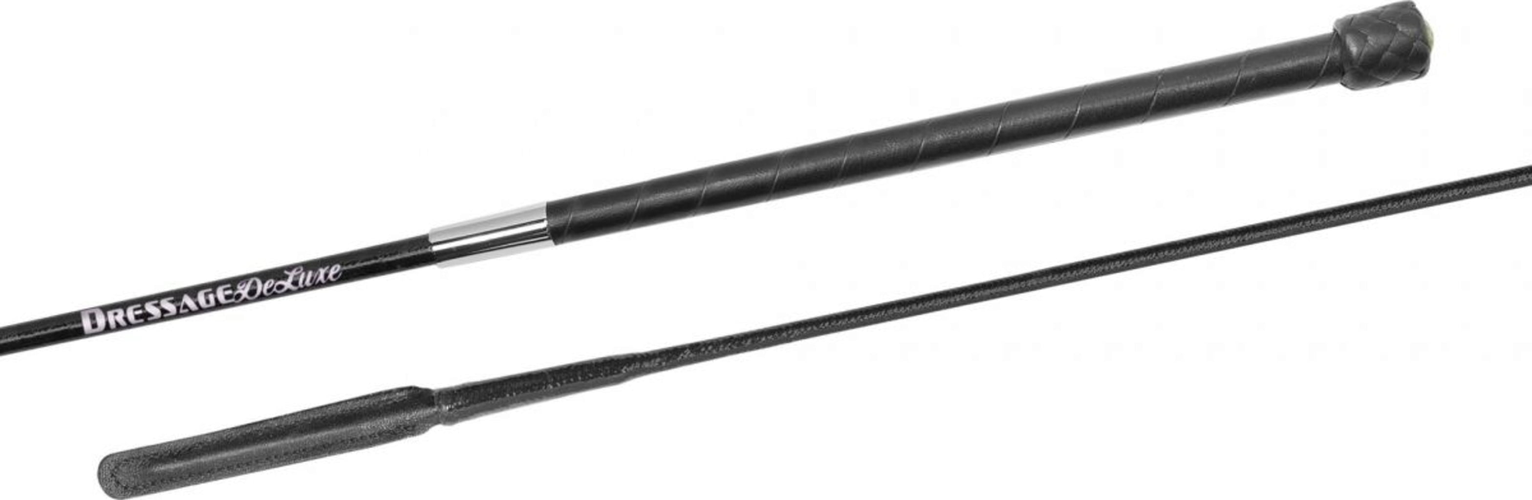 Die edle Dressurgerte besteht aus einem hochwertig lackierten Garngespinst mit weicher Fiberglas-Einlage. An den Enden befinden sich ein geflochtener Lederknopf, sowie eine feine Lederzunge. Der schlanke Deluxe Ledergriff sorgt für ein außergewöhnlich elegantes Auftreten.