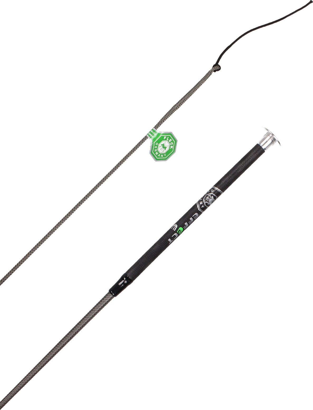 Die aus groben Nylongespinst gefertigte Gerte ermöglicht eine präzise Hilfegebung. Das besondere an Ihr sind der schlanke PU-Effect-Griff mit Aluminiumknopf, sowie die Effect-Spitze.