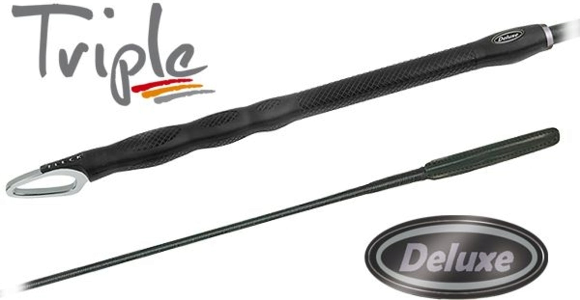 Hervorzuheben ist der TRIPLE-BALANCE-Griff, der mit seinem innovativen, sportlichen Design, Funktionalität auf höchstem Niveau erreicht. Maximal haftendes Material und eine ergonomische Dreiecksform, mit abgestuften Griffstärken, gewähren ein komfortables und unvergleichbares Handling. Beim TRIPLE DeLuxe Modell handelt es sich um eine Dressurgerte mit weichem Gertenschaft und einer feinen Lederzunge.