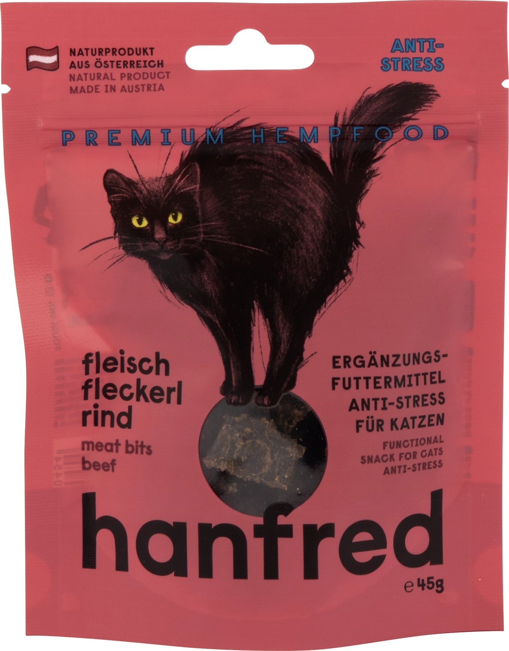 Wenn deine Katze sensibel auf Veränderungen oder stressige Situationen reagiert, kann dieser Snack eine gute Wahl sein. Die Hanfred Fleisch-Fleckerl bestehen aus 95 % Fleisch und 5 % Hanfpulver – ganz ohne Getreide und künstliche Zusätze.