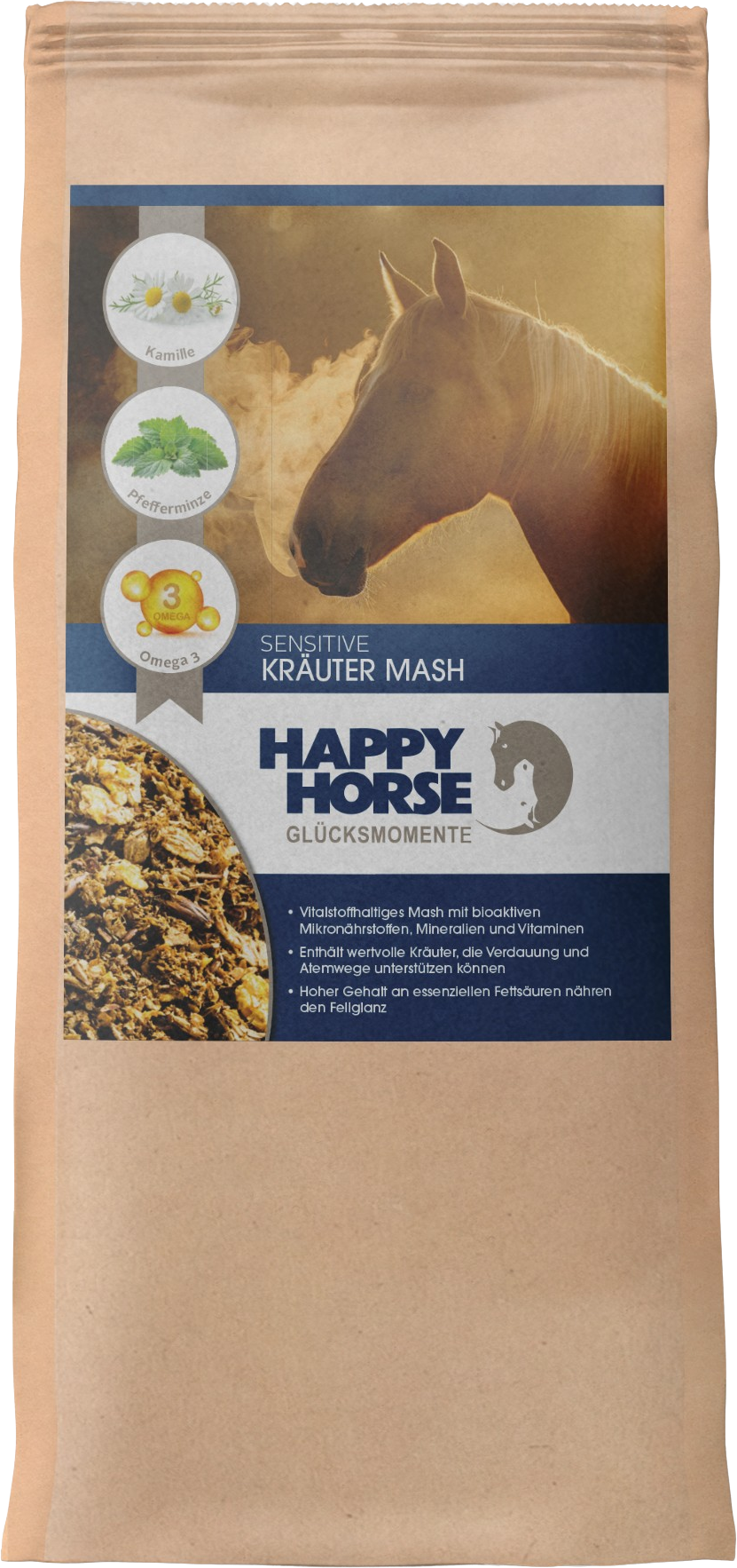 Happy Horse Sensitiv Kräuter Mash ist die ideale Ergänzung für Pferde mit empfindlicher Verdauung. Die Mischung aus Fenchel, Pfefferminze sowie ausgesuchten Vitaminen und Mineralstoffen unterstützt die tägliche Fütterung besonders in Zeiten hoher Belastung oder bei Wetterwechsel.