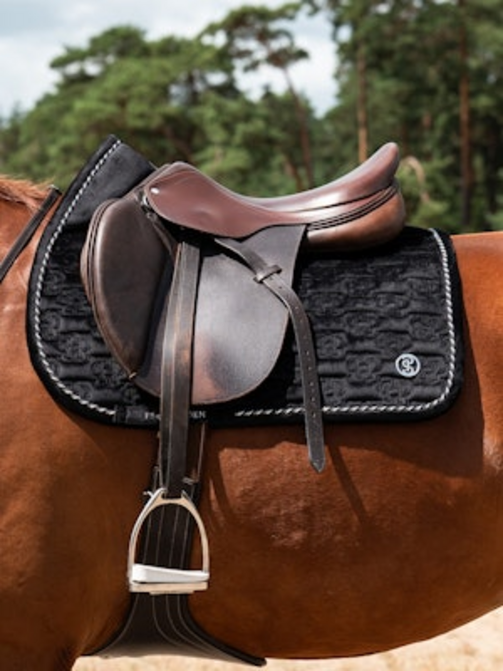 Die Schabracke Velvet Monogram verbindet luxuriöses Design mit optimaler Funktion. Anatomisch geformt, bietet sie deinem Pferd zusätzlichen Platz am Widerrist für mehr Bewegungsfreiheit und Wohlbefinden. Das weiche Samtmaterial sorgt für ein angenehmes Tragegefühl, während das samtumrandete Einfassband Scheuern verhindert.