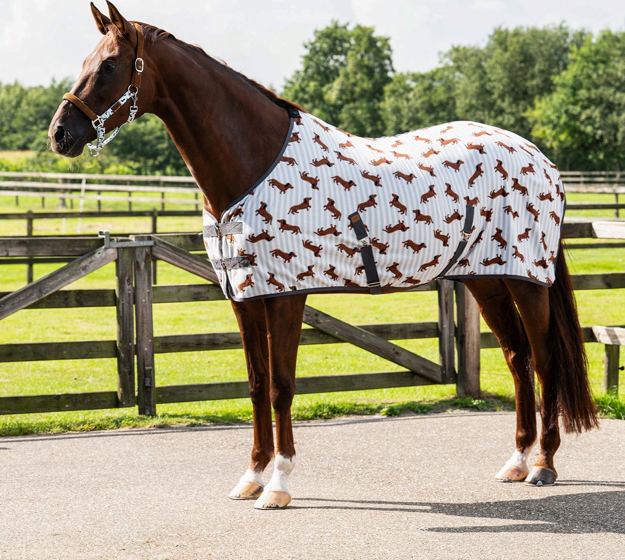 Den perfekten und rutschfesten Sitz stellst du ganz einfach über den sicheren Frontverschluss, die Kreuzgurte und den praktischen Schweifriemen ein. Natürlich darf auch bei dieser Abschwitzdecke der charmante Stable-Buddy-Druck mit dem beliebten Dackel-Motiv nicht fehlen – so zieht dein Pferd auf der Stallgasse garantiert alle Blicke auf sich!