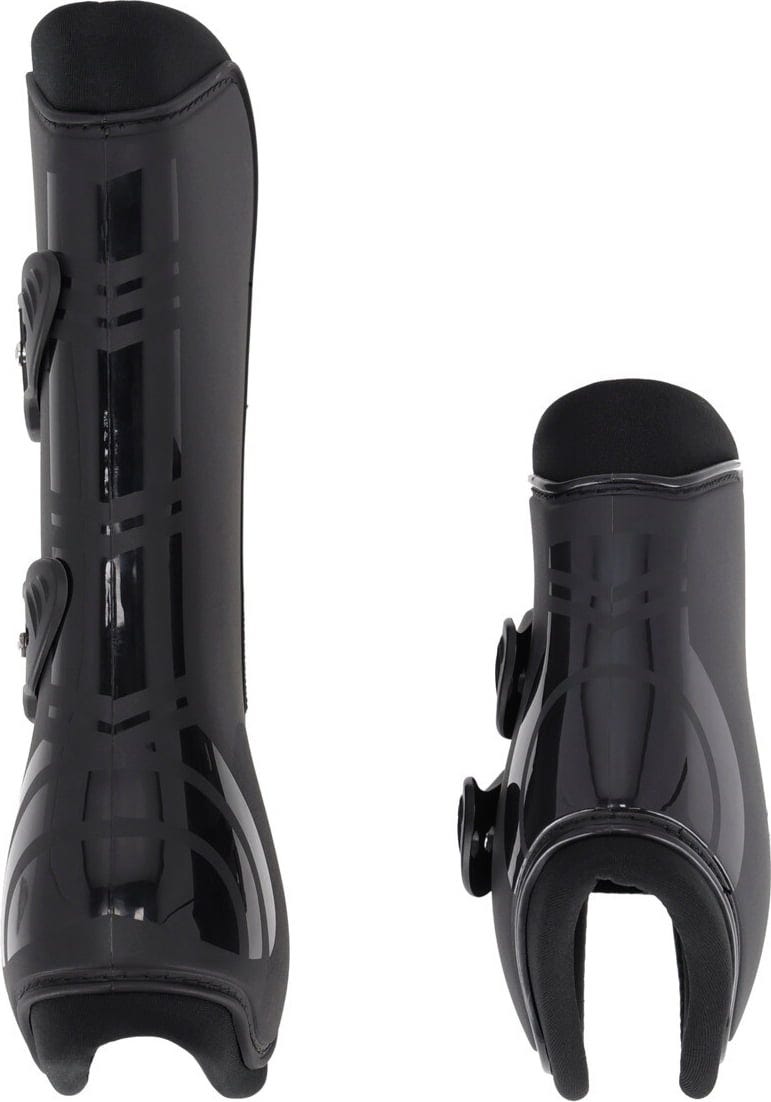 Die anatomisch geformten Protektoren bestehen außen aus einer robusten, harten Kunststoffschale (Polyurethan) in mattem Finish, akzentuiert durch glänzende Streifen für einen sportlichen Look. Für maximalen Komfort sorgt die Innenseite, die mit einem weichen Neoprenfutter ausgekleidet ist. Die Gamaschen sind außerdem besonders leicht und lassen sich dank der elastischen Schnellverschlüsse mühelos und in Sekundenschnelle anlegen und befestigen!
