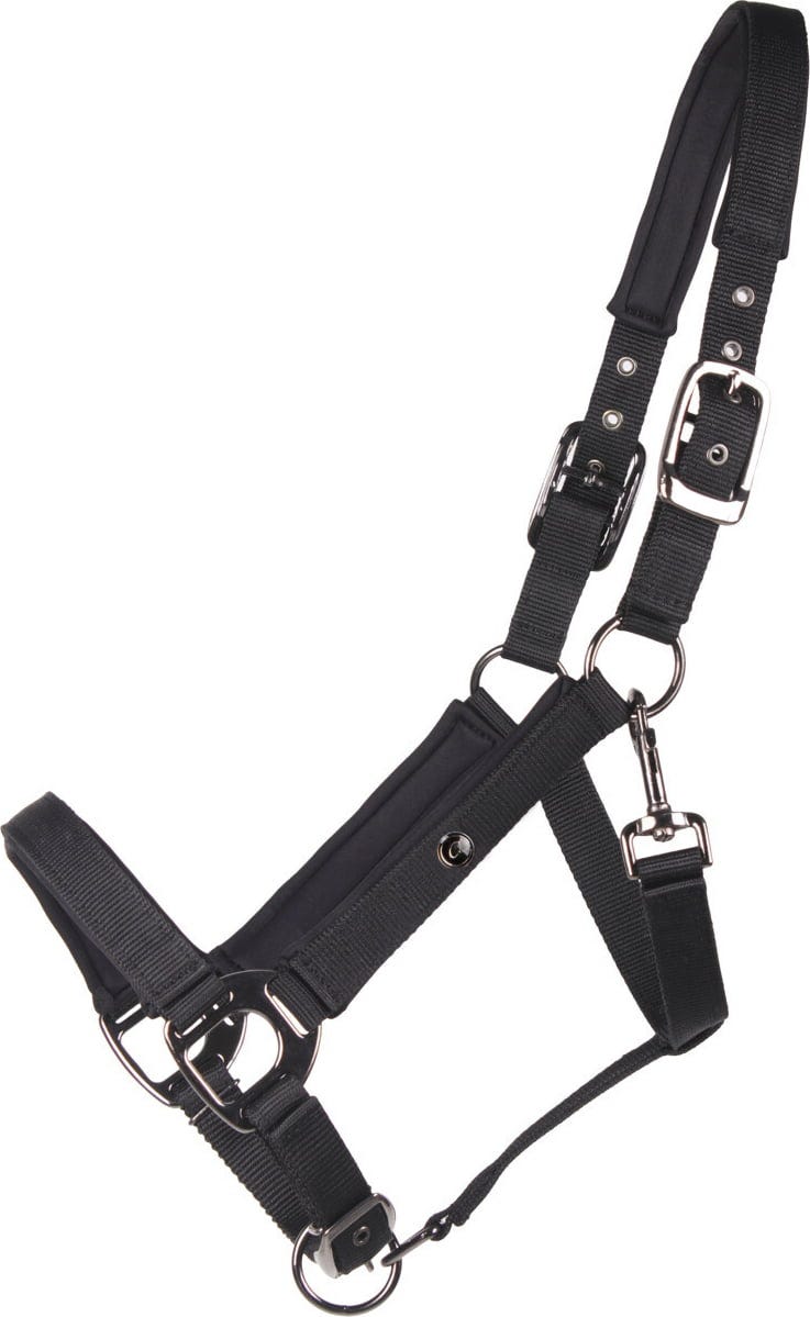 Für eine optimale Passform lässt sich dieses Halfter ganz einfach an zwei Stellen verstellen: sowohl am Kopfstück als auch am Nasenriemen. Die hochwertigen schwarzen Metallkurzwaren aus Zink verleihen dem Halfter eine elegante Optik und werden durch den praktischen Karabinerverschluss an der Kehle ergänzt, der das An- und Ablegen zum Kinderspiel macht!