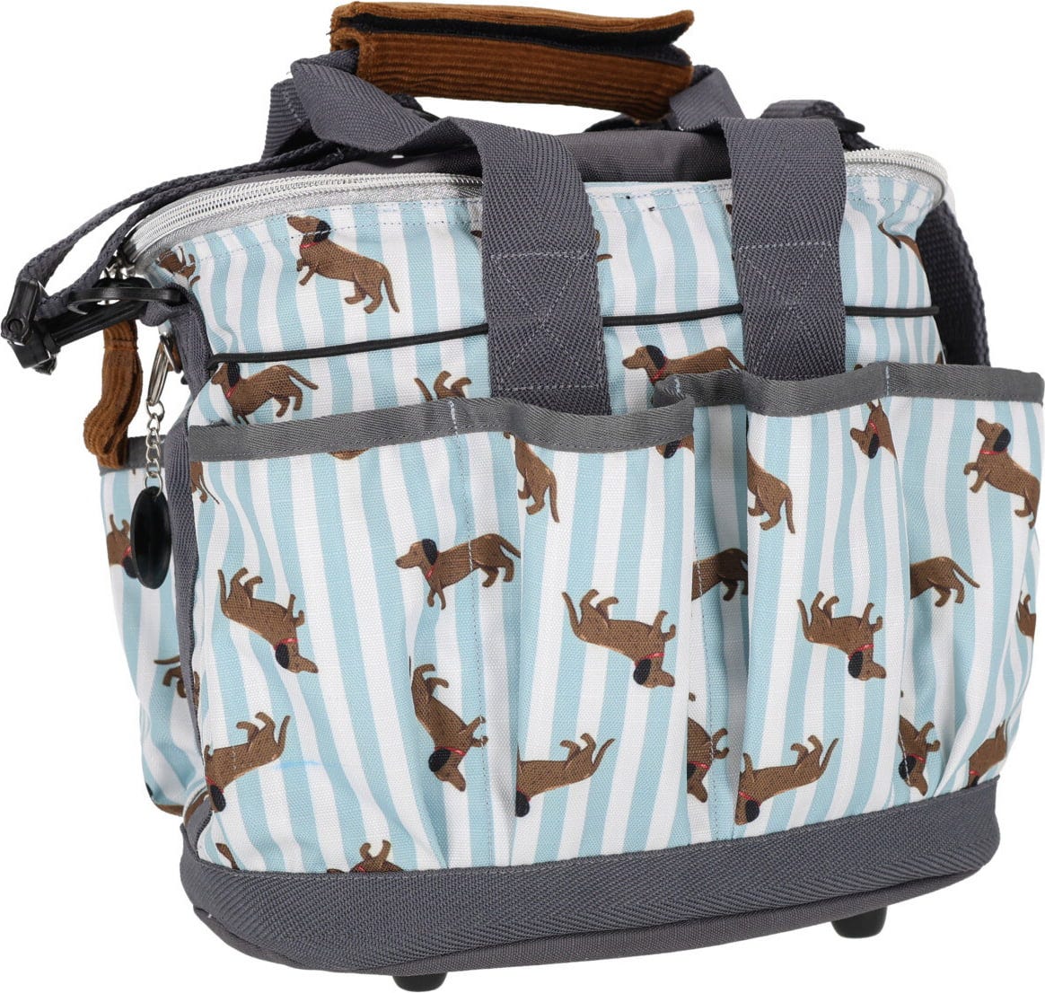 Den Weg zum Putzplatz legst du dank der bequemen Handgriffe und des abnehmbaren Schultergurts flexibel zurück. Robuste Kunststofffüße bewahren den Taschenboden beim Abstellen effektiv vor Nässe und Schmutz. Der fröhliche Dackel-Druck, das edle Cordsamt-Logo und der süße Schlüsselanhänger machen diesen praktischen Helfer zu einem echten Hingucker in deiner Sattelkammer.