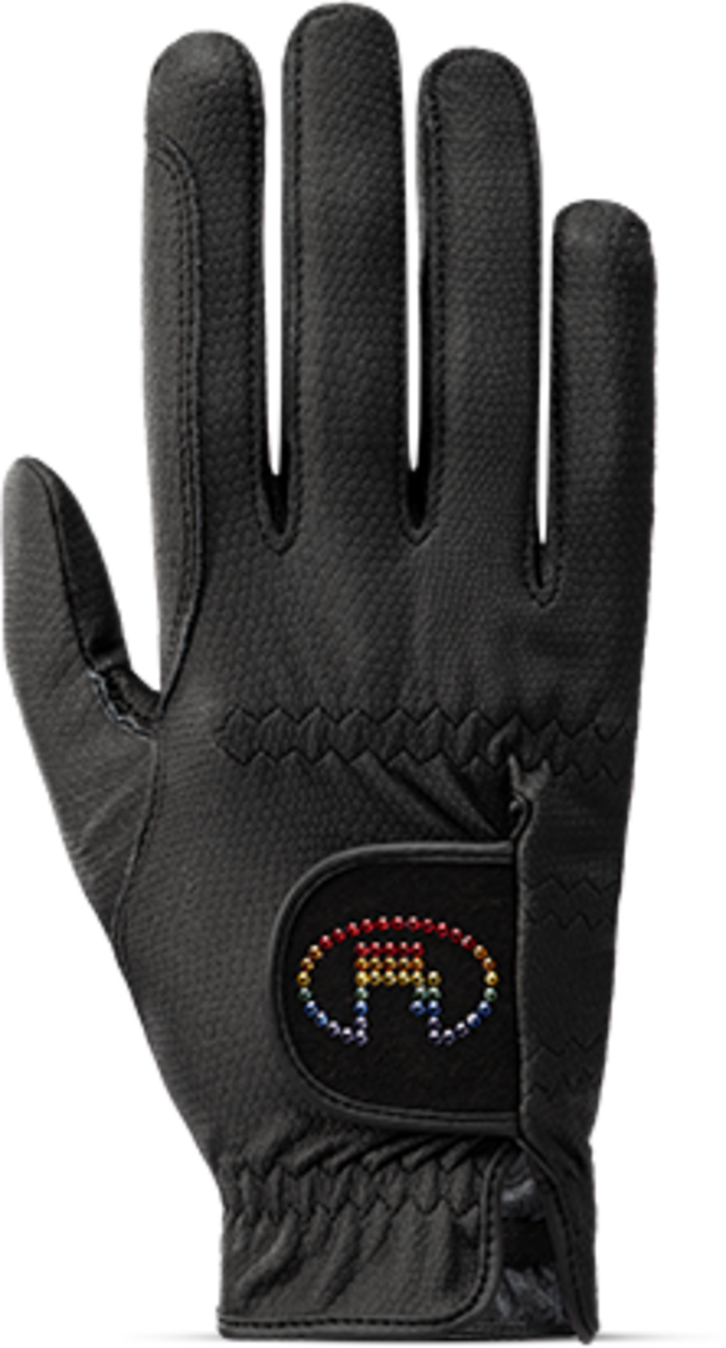 Der klassische Reithandschuh MARNE ist in schlichtem Weiß gehalten. Abgerundet mit einem Roeckl-Logo aus stilvollem Swarovski-Steinchen in Regenbogenfarben. Roeckl setzt mit diesen Farben ein Zeichen und unterstützt die Werte der LGBTQ-Community.