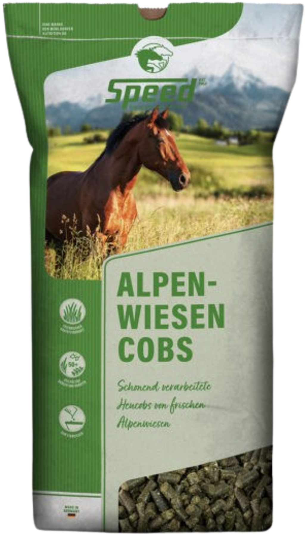 SPEED Alpenwiesen Cobs sind ein hochwertiges, faserreiches Heufutter aus schonend verarbeiteten Gräsern und Kräutern, die zum optimalen Erntezeitpunkt auf saftigen Alpenwiesen gemäht werden. Die extensive, traditionelle Bewirtschaftung sorgt für maximale Natürlichkeit und Reinheit im Futtersack.