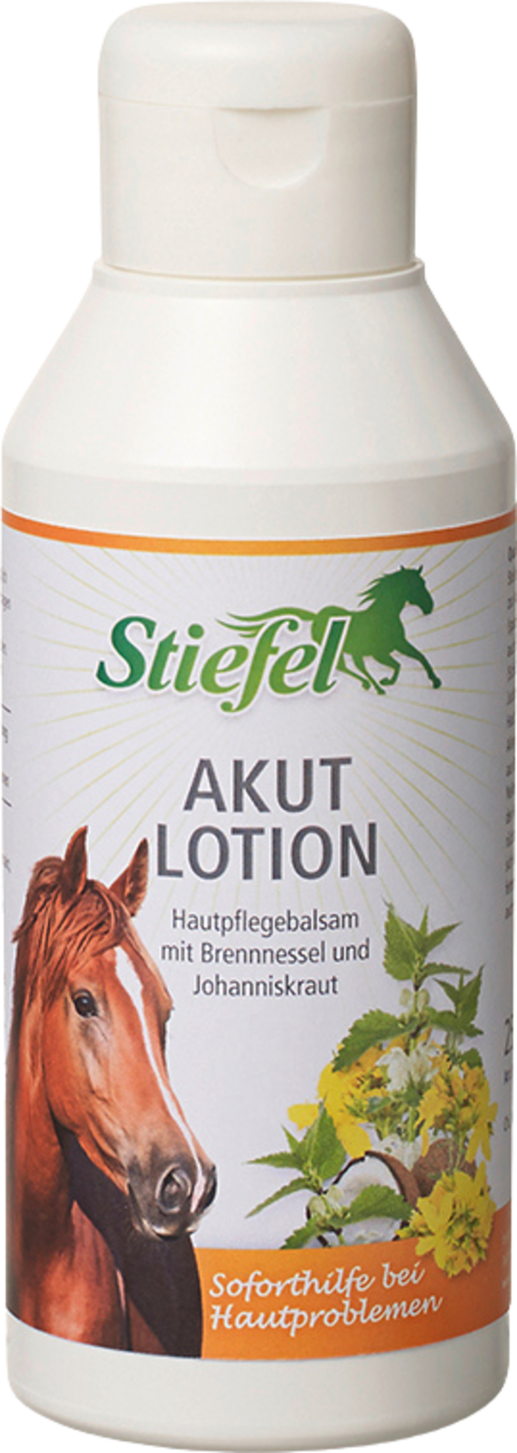 Stiefel Akutlotion ist eine spezielle Lotion mit pflanzlichen Extrakten aus Brennnesseln, Johanniskraut und Nelken zur Behandlung der Haut bei Hautinfektionen (speziell in der Fesselbeuge), mechanischen Schädigungen (Schürfwunden), Sonnenbrand und mit Juckreiz verbundenen Irritationen der Haut (besonders im Sommer). Der Hautpflegebalsam zieht schnell und rückstandsfrei in die Haut ein. Dadurch wird die Haut weich und geschmeidig ohne zu fetten. Stiefel Akutlotion ist auch für Allergiker geeignet.