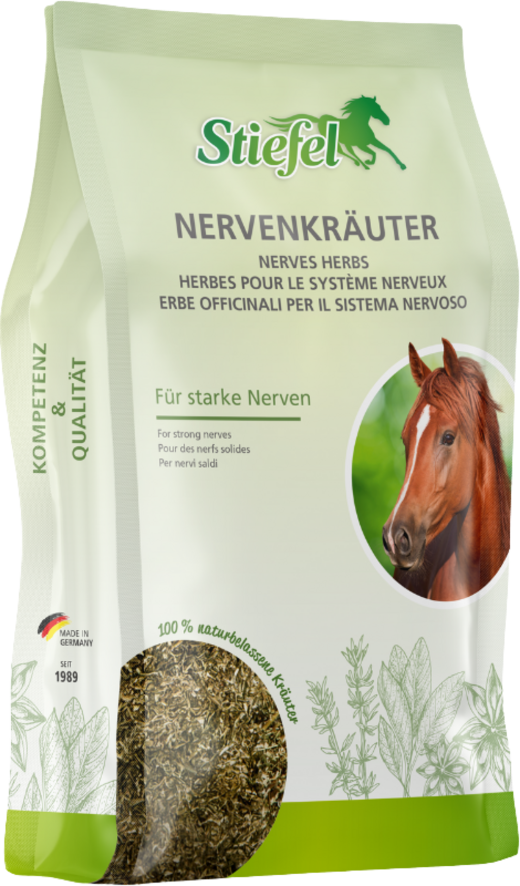 Stiefel Nervenkräuter sind eine speziell ausgewählte, naturbelassene Kräutermischung zur Fütterung in Belastungssituationen, bei Nervosität oder Gereiztheit. Die Kräuter können sich positiv auf das Nervenkostüm des Pferdes auswirken und so in aufregenden Situationen für mehr Ruhe und Gelassenheit sorgen.