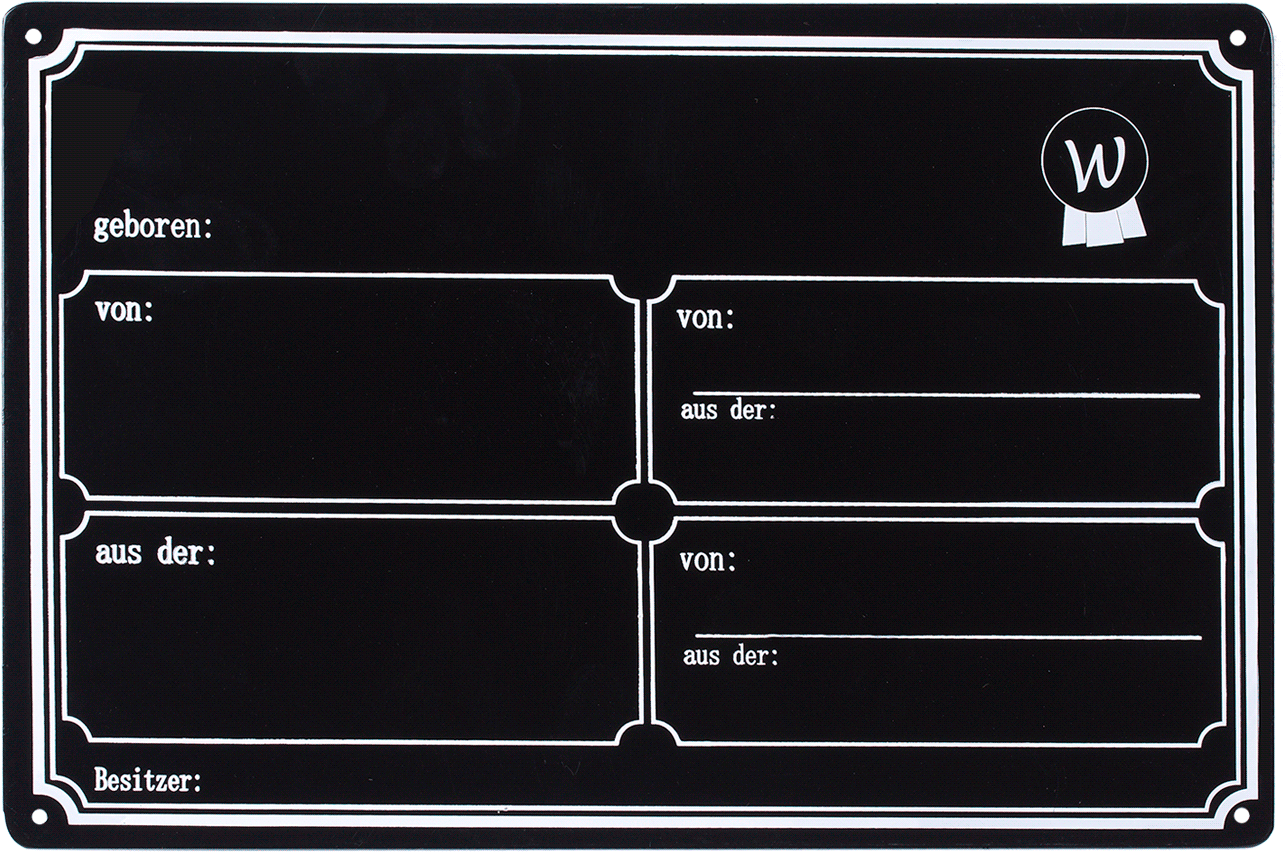 Das Schild präsentiert sich in klassischem Schwarz-Weiß-Design und bietet reichlich Platz für alle wichtigen Informationen deines Pferdes. In den liebevoll gerahmten Feldern kannst du mit Kreide oder einem passenden Stift die Abstammung, das Geburtsdatum und den Besitzer eintragen. So haben alle auf den ersten Blick alle nötigen Daten im Blick.